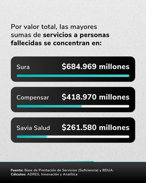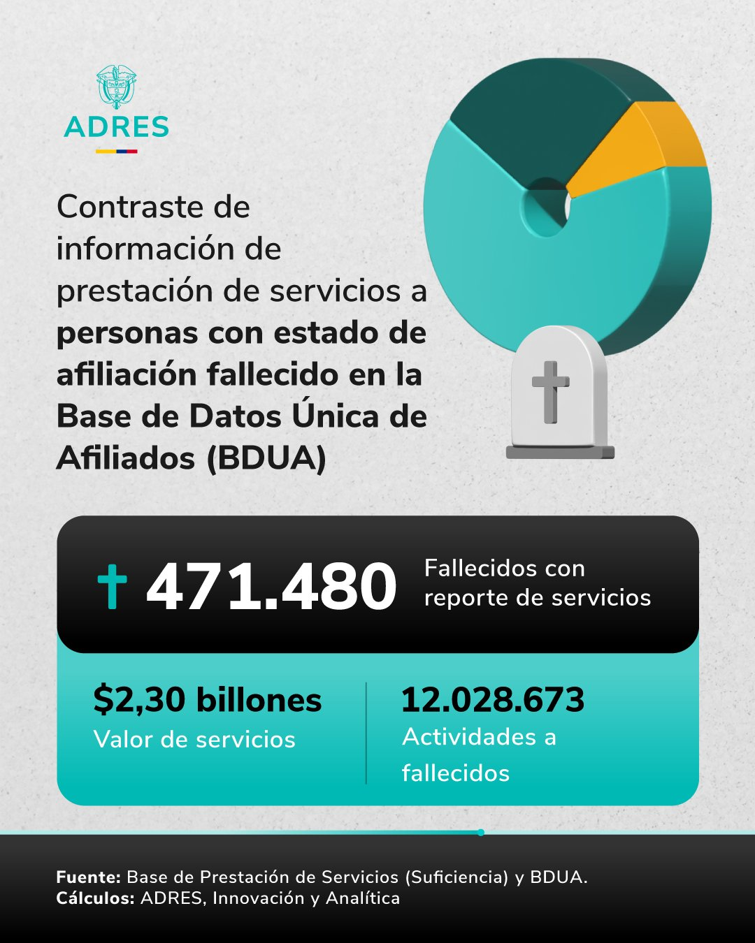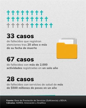 Según la ADRES, hay 33 casos en los que las EPS cobraron falsas prestaciones de servicios a personas que llevaban más de 20 años de fallecidos. Hay 67 casos de personas fallecidas a las que les reportaron más de dos mil servicios médicos en un solo año. De igual manera, hay 28 casos de personas fallecidas a las que les reportaron servicios médicos por más de $500 millones de pesos a cada uno.