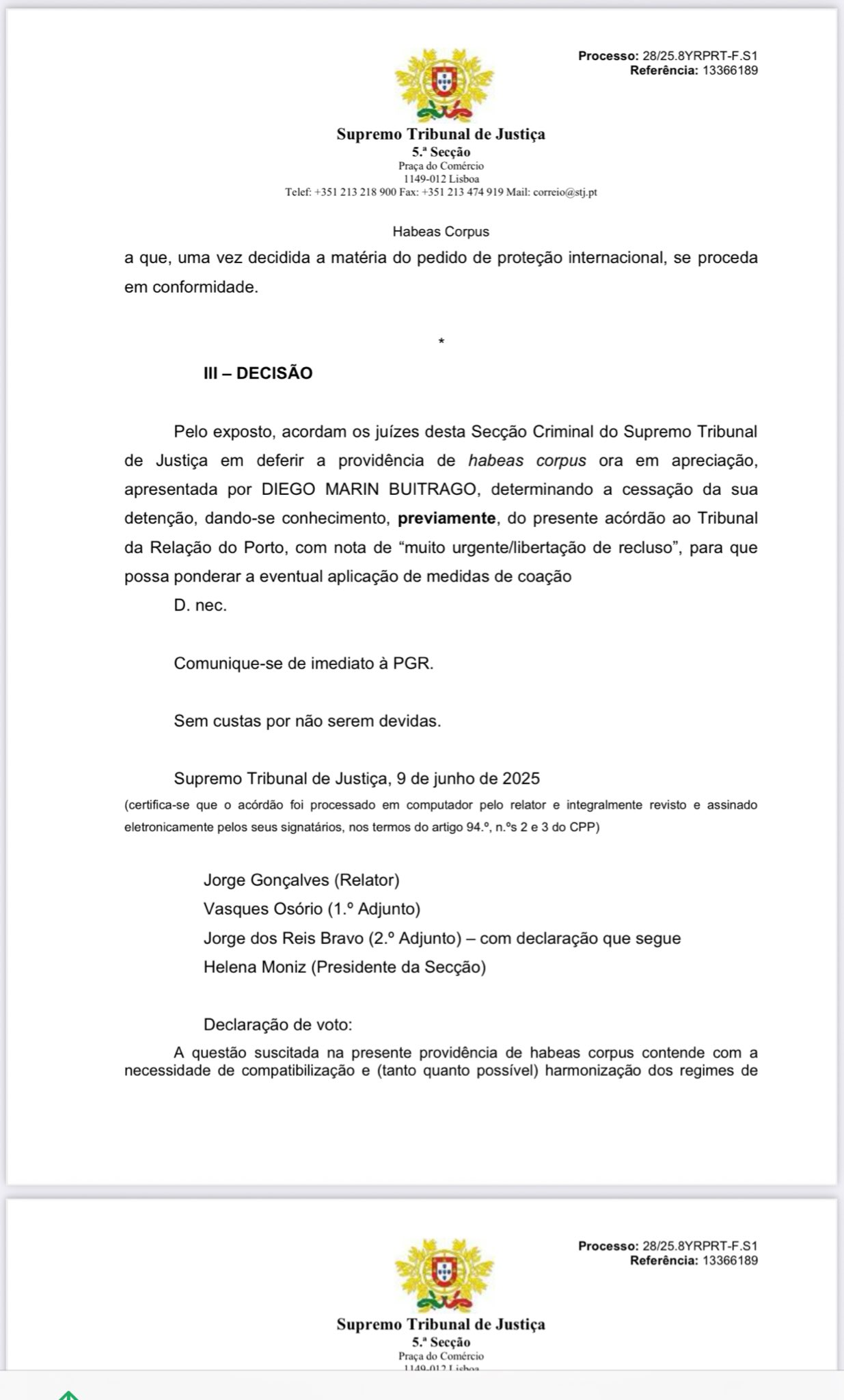 La justicia de Portugal expresó que la liberación de Marín obedeció a la solicitud de habeas corpus, lo que confirma que su detención fue irregular. No obstante, eso no quiere decir que no continúe el proceso legal en su contra.