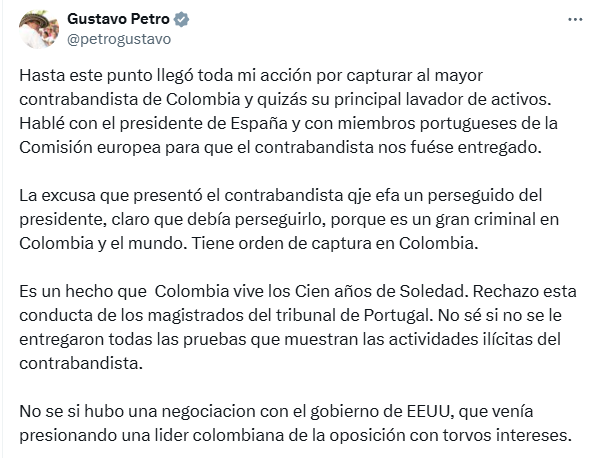 La noticia fue sorpresiva en Colombia, donde se esperaba que llegara extraditado en los próximos días, como ya lo había anunciado la fiscal Luz Adriana Camargo. El presidente Gustavo Petro se pronunció sobre la situación y expresó que rechaza la “conducta de los magistrados del tribunal de Portugal”.