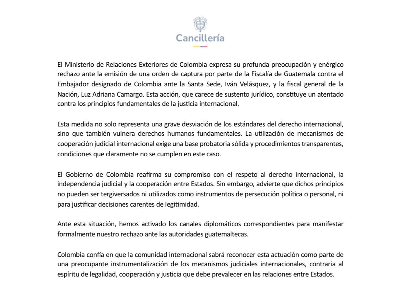 El Gobierno de Colombia, a través de la Cancillería, rechazó la orden de captura emitida y expresó “profunda preocupación”, pues la decisión carece de sustento y “constituye un atentado contra los principios fundamentales de justicia internacional”.