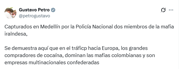 La Policía y la Interpol coordinaron un operativo en una vivienda de la ciudad de Medellín para capturar a dos ciudadanos británicos requeridos en Inglaterra por diferentes delitos. El presidente Gustavo Petro y el director de la Policía, brigadier general William Rincón expresaron que los sujetos serían miembros de la mafia irlandesa.