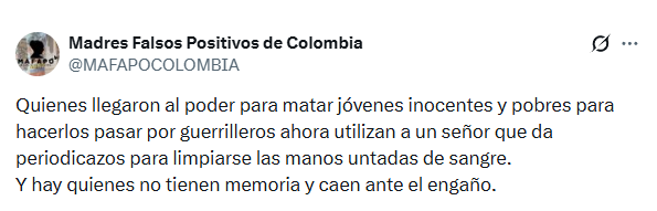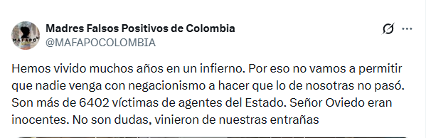 Otras publicaciones de las madres tienen fragmentos como: “Quienes llegaron al poder para matar jóvenes inocentes y pobres para hacerlos pasar como guerrilleros ahora utilizan a un señor que da periodicazos para limpiarse las manos untadas de sangre” y “Hemos vivido muchos años en un infierno. Por eso no vamos a permitir que nadie venga con negacionismo a hacer que lo de nosotras no pasó. Son más de 6.402 víctimas de agentes del Estado. Señor Oviedo, eran inocentes. No son dudas, vinieron de nuestras entrañas”.