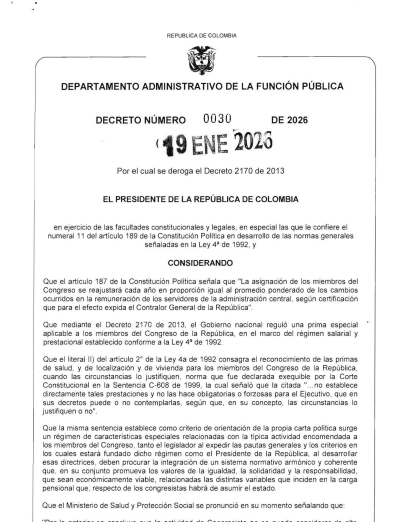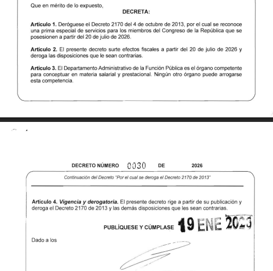“Deróguese el Decreto 2170 del 4 de octubre de 2013, por el cual se reconoce una prima especial de servicios para los miembros del Congreso de la República que se posesionen a partir del 20 de julio de 2026”, dice el Artículo 1 del decreto.