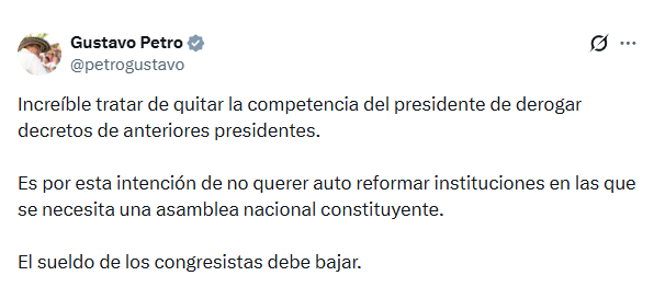 El Consejo de Estado admitió una demanda, interpuesta por un abogado identificado como Sady Andrés Orjuela Bernal, que busca que se anule el decreto 0030 del 19 de enero de 2026, el cual había sido expedido por el presidente Gustavo Petro para reducir el sueldo de los congresistas colombianos.