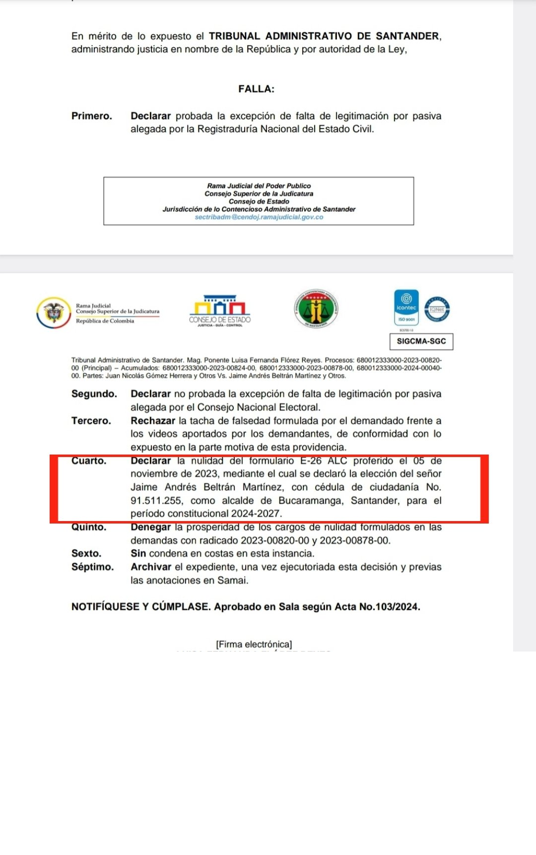 El caso inició el pasado 12 de diciembre, cuando el Tribunal Administrativo de Santander declaro nula la elección de Jaime Andrés Beltrán, conocido como ‘El Bukele Colombiano’, como alcalde de Bucaramanga por incurrir en doble militancia durante la campaña a ese cargo en el año 2023.