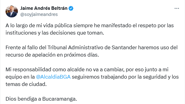 El Consejo de Estado anunció el jueves 22 de mayo que rechazó los recursos presentados por el equipo jurídico de Jaime Andrés Beltrán, alcalde de Bucaramanga, para que invalidara el proceso del Tribunal Administrativo de Santander que declaró nula la elección de este como mandatario de esa ciudad por doble militancia.