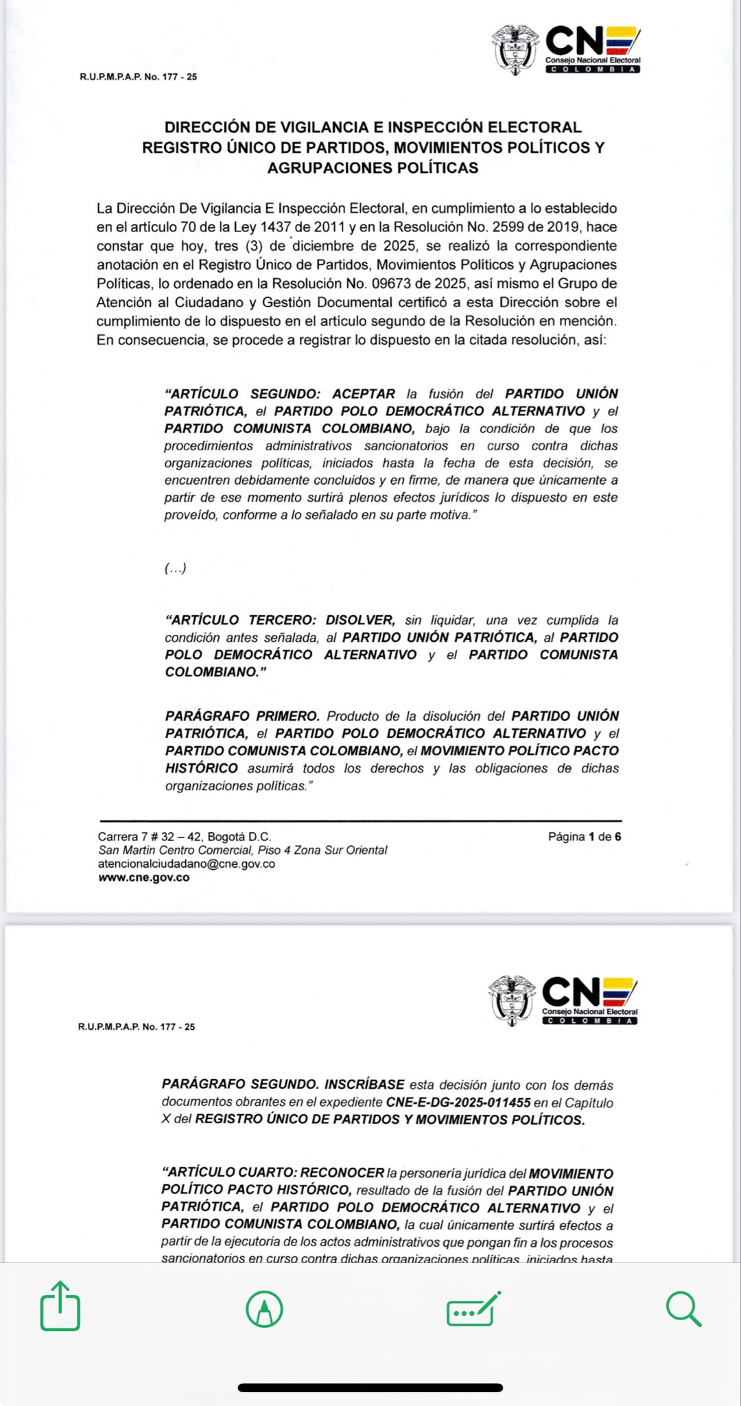 Este miércoles 3 de diciembre la Dirección de Vigilancia e Inspección Electoral del Consejo Nacional Electoral anunció que se aprobó la fusión del Pacto Histórico como partido político y fue anotado en el Registro Único de Partidos, Movimientos Políticos y Agrupaciones Políticas.