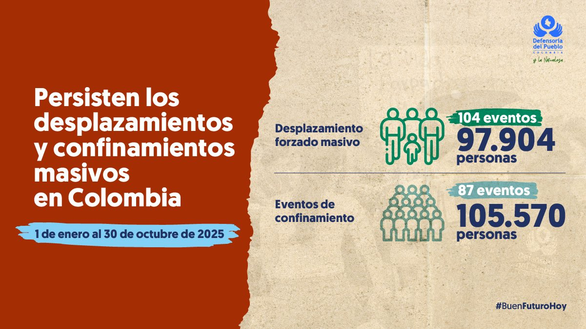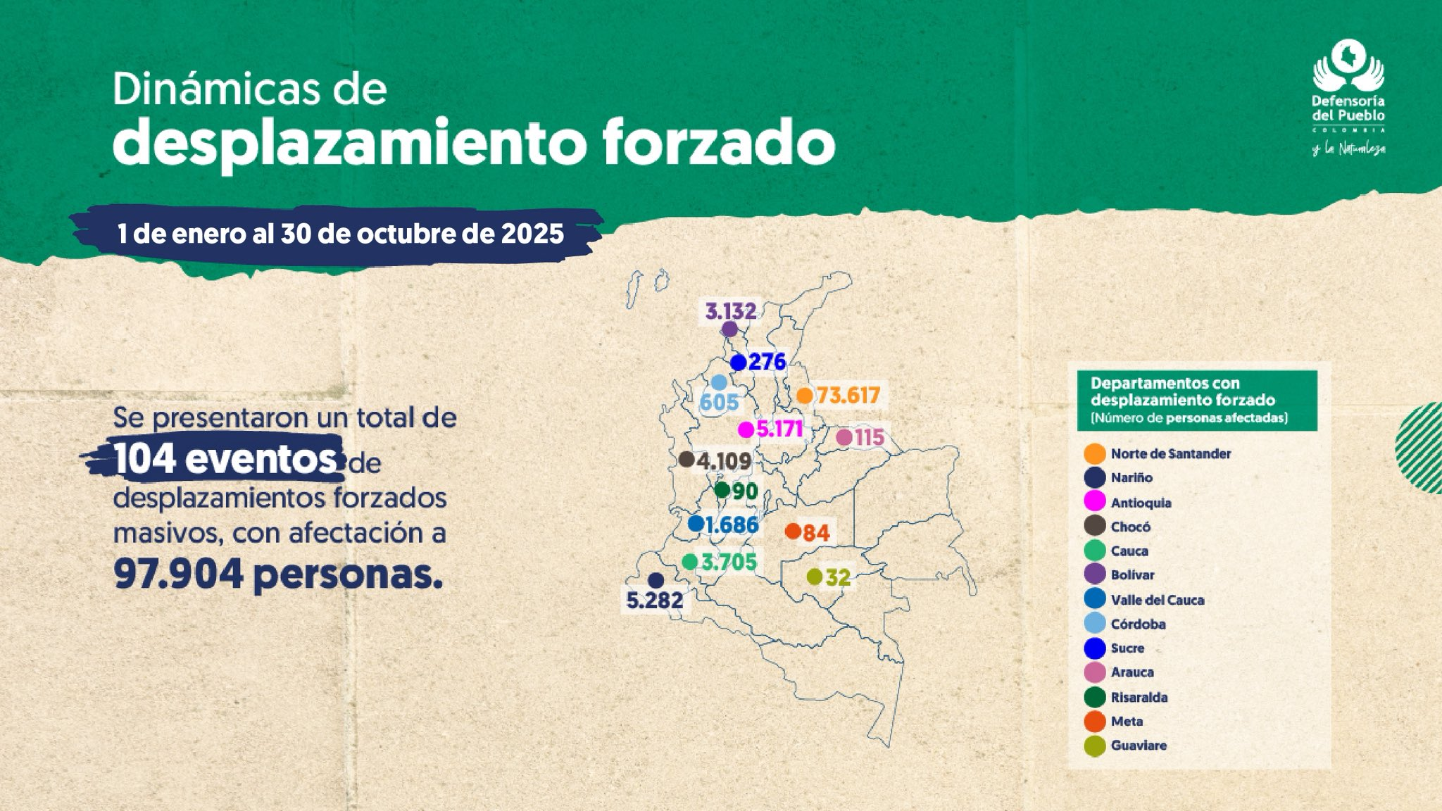 La Defensoría del Pueblo anunció que entre enero y octubre de 2025 se presentaron en Colombia 104 eventos de desplazamiento forzado masivo, por parte de grupos armados, que afectaron a 97.904 personas. Ni siquiera llenando dos veces el estadio Metropolitano de Barranquilla alcanzarían a estar esa cantidad de víctimas.