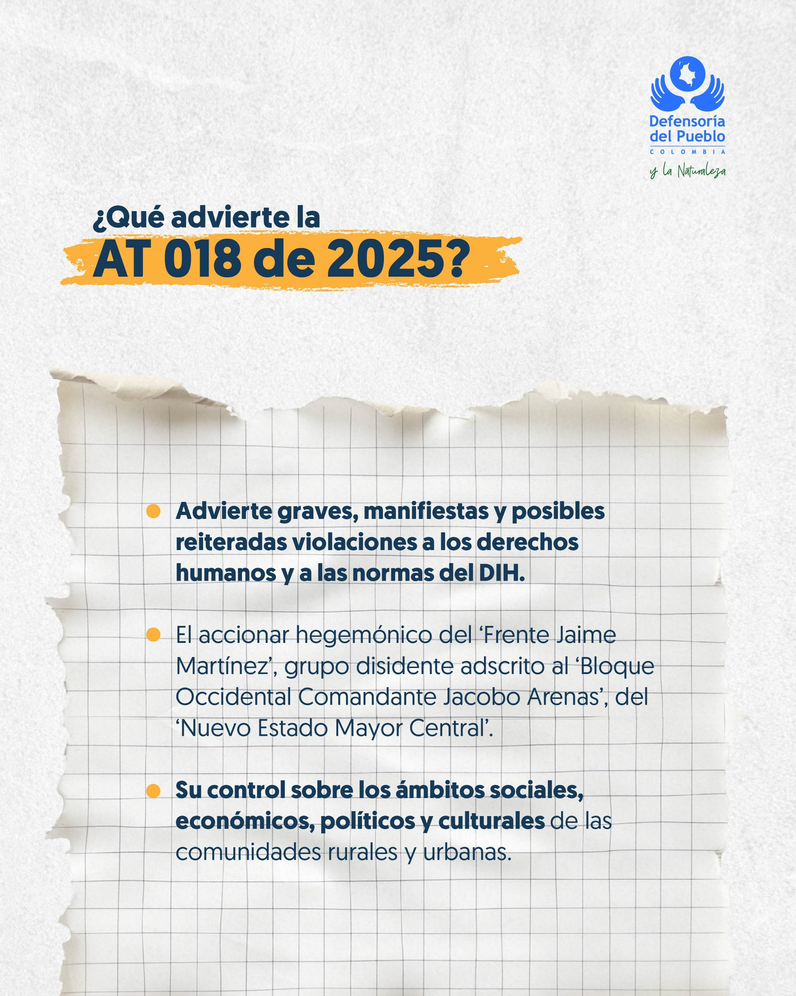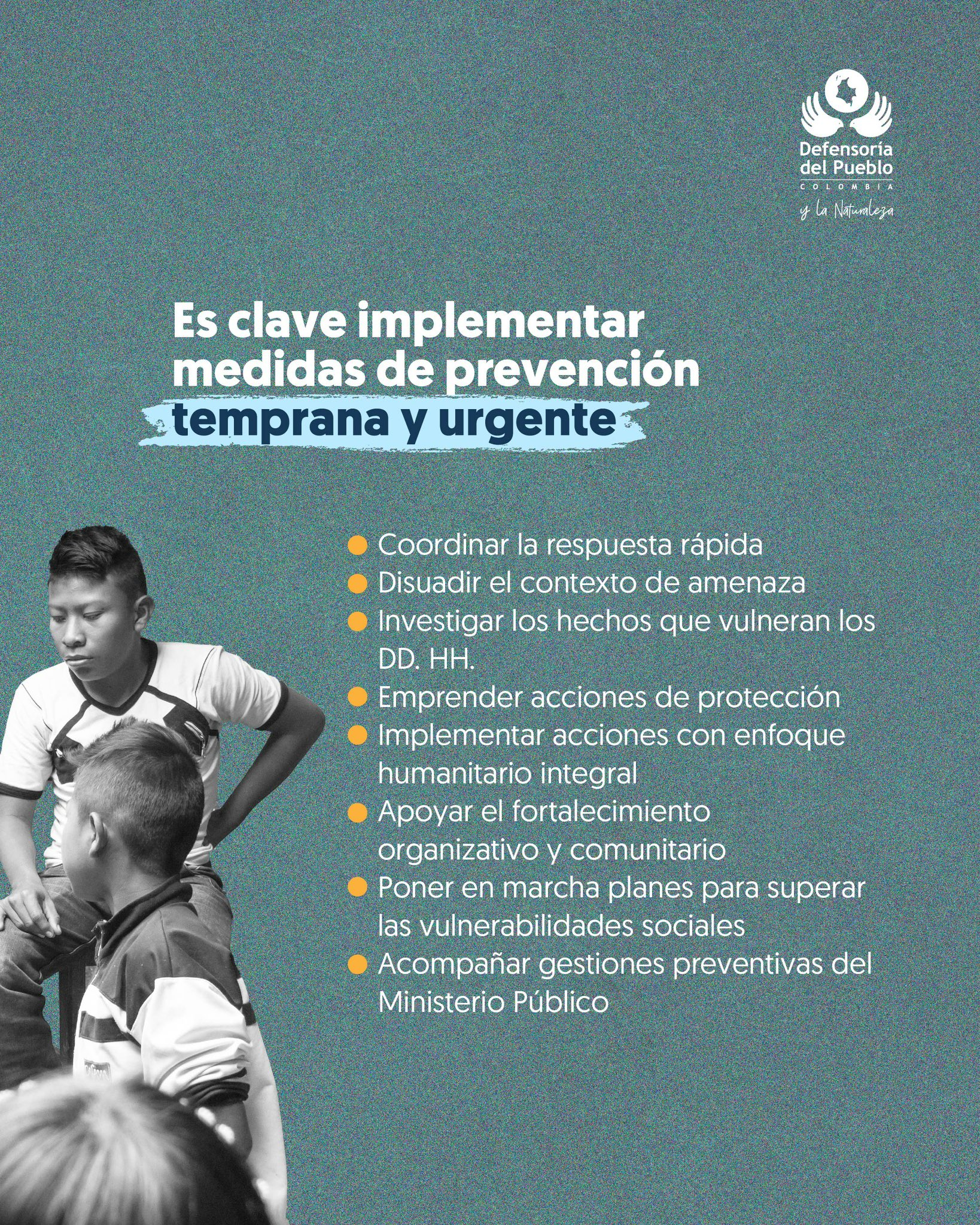 Según el documento de la Alerta Temprana 018 de 2025, se emiten 28 recomendaciones a las autoridades para atender los riesgos de la comunidad y garantizar su seguridad. Para la Defensoría es esencial que el Ministerio de Defensa, la Fiscalía, la Gobernación del Cauca, el Instituto Colombiano de Bienestar Familiar, entre otros, implementen las recomendaciones para mitigar el peligro de los civiles.