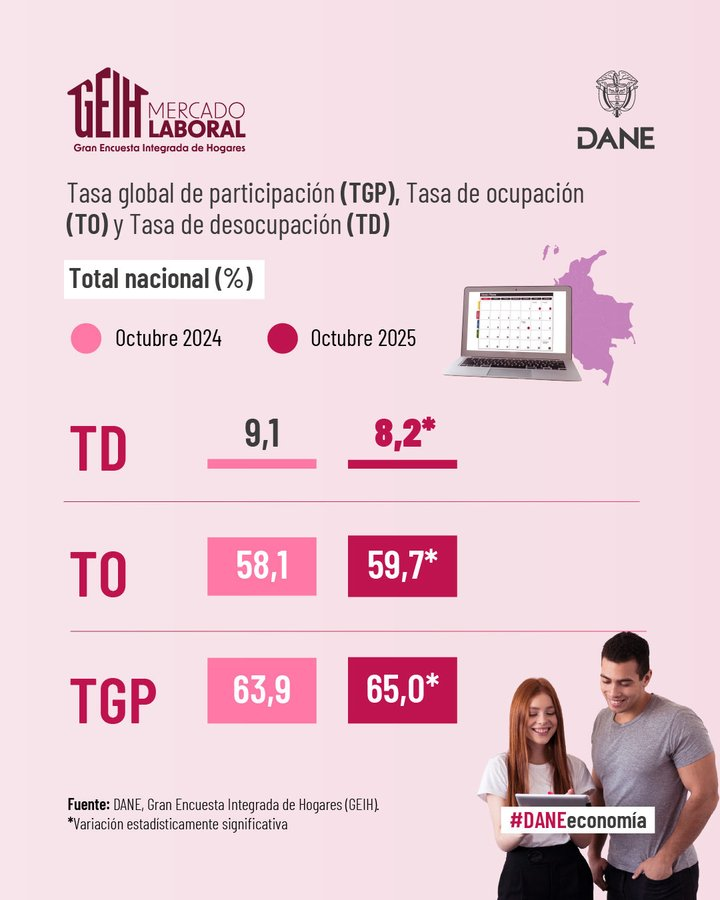 El Departamento Administrativo Nacional de Estadística (DANE) presentó este viernes 28 de noviembre las cifras de desempleo de octubre de 2025. La tasa de desocupación se ubicó en 8,2%, alcanzando la más baja desde el año 2014.