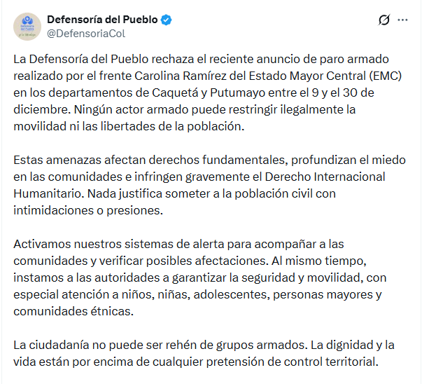 Según la Defensoría del Pueblo, “Estas amenazas afectan derechos fundamentales, profundizan el miedo en las comunidades e infringen gravemente el Derecho Internacional Humanitario. Nada justifica someter a la población civil con intimidaciones o presiones”.