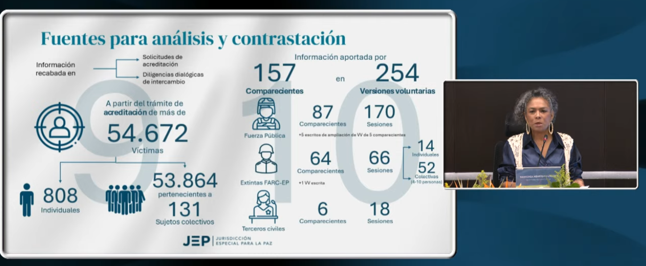 Para imputar a estas personas la JEP tuvo en cuenta información presentada por 808 personas. Hubo aportes de 157 comparecientes y se revisaron 115 informes de organizaciones civiles y de víctimas.