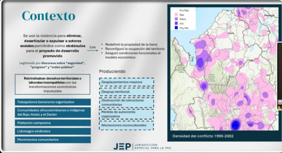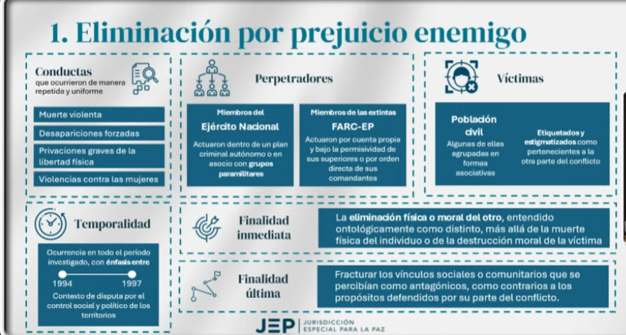 Es la primera vez que la JEP toma una decisión que involucra a tres actores juntos que son de su competencia: Farc, fuerza pública y terceros civiles. Según las investigaciones, estas personas estuvieron involucradas, de alguna manera, entre 1986 y 2002 en casos de desplazamientos forzados, muertes violentas, torturas, tratos cueles, violencia sexual, despojo de tierras y violencia basada en género.