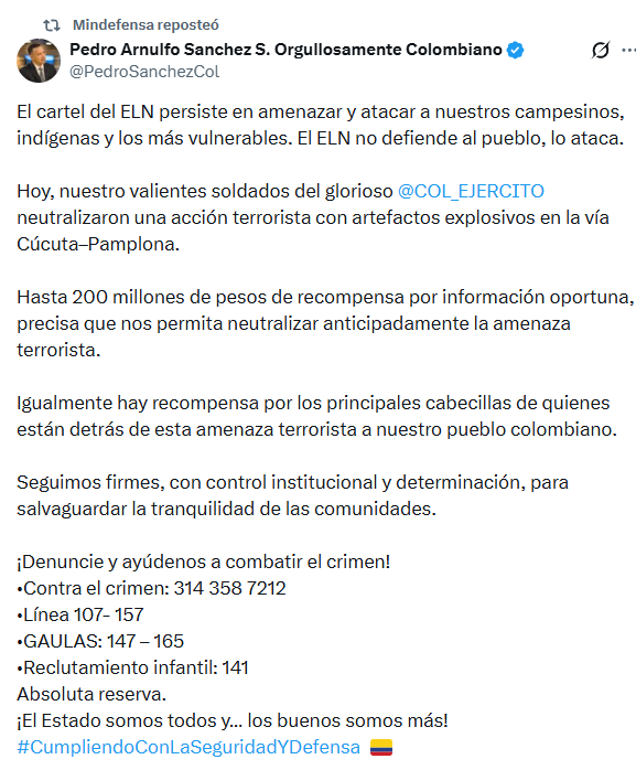 El presidente Gustavo Petro, por su parte, anunció que se ordenó a la fuerza pública atacar a los miembros del ELN. El ministro Sánchez anunció recompensas de $200 millones de pesos a quien dé información que permita adelantarse a las acciones de ese grupo armado. Además, recordó que hay millonarias recompensas por información que permita capturar a los cabecillas.