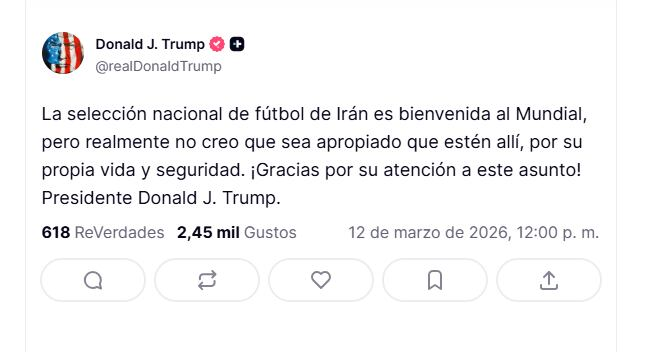 «La selección nacional de fútbol de Irán es bienvenida al Mundial, pero realmente no creo que sea apropiado que estén allí, por su propia vida y seguridad», aseguró Trump, quien, además, aseguró que iba a permitir el ingreso a Estados Unidos del equipo, pero no de hinchas.