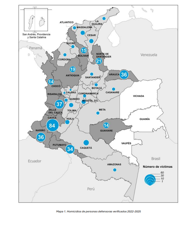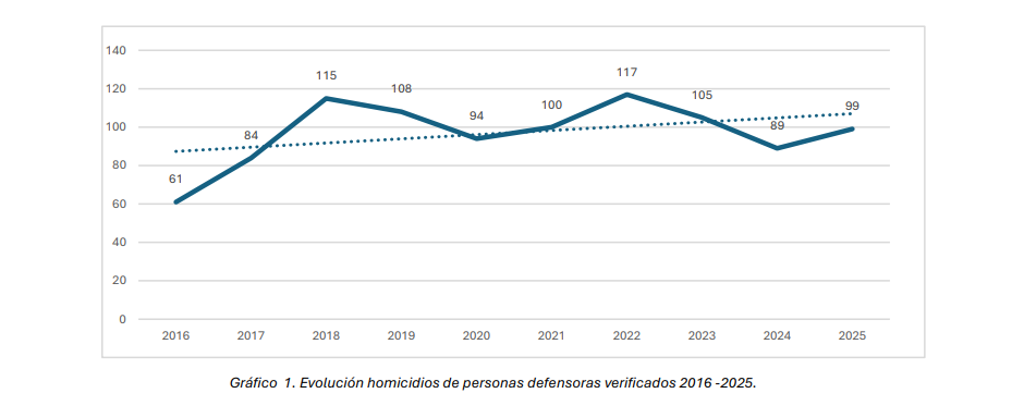 Entre las 972 víctimas documentadas desde el año 2016, hay 112 mujeres, 843 hombres y 17 personas LGTBI+. Los casos habían tenido una reducción consecutiva en 2022, 2023 y 2024. Sin embargo, en el 2025 el pico ascendió nuevamente al llegar a un total de 99 asesinatos de defensores de derechos humanos.