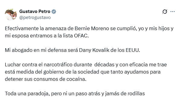 Después de conocer la confirmación de la noticia, el presidente Gustavo Petro se pronunció en sus redes sociales: