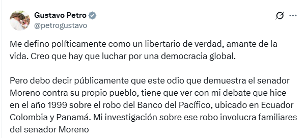 Moreno había dicho reiteradamente, aunque sin presentar pruebas, que Gustavo Petro “fue elegido gracias a la ayuda de los carteles de la droga (…) vamos a incluirlo a él, a su familia extendida y a sus cómplices en la lista OFAC (Lista Clinton)”.