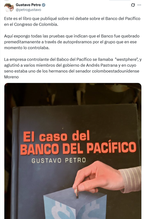 Gustavo Petro y la familia colombiana Moreno, de la que hace parte el senador Bernie, quien en realidad se llama Bernardo, son viejos conocidos. En el año 2005 Gustavo Petro escribió un libro llamado El Caso del Banco del Pacífico, en el que asegura que el extinto Banco del Pacífico fue quebrado intencionalmente por un grupo de empresarios, entre los cuales está Luis Alberto Moreno, hermano de Bernie Moreno.