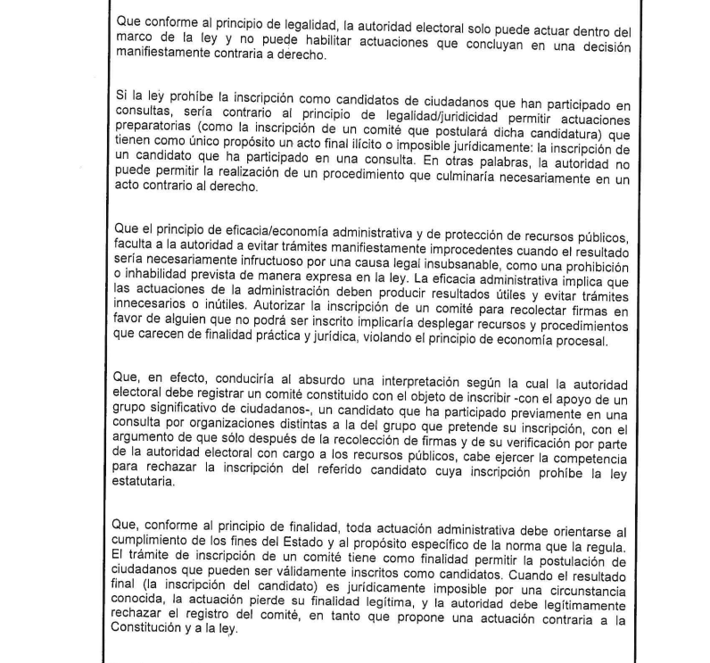En el documento de ocho páginas se califica, incluso, como “absurda” la posibilidad de que se registre un comité de recolección de firmas para alguien que participó previamente en una consulta: