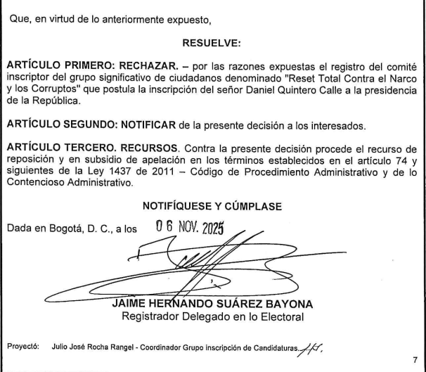 La Registraduría Nacional del Estado Civil anunció este jueves 6 de noviembre que rechazó la solicitud de Daniel Quintero de registrar un comité de recolección de firmas para su inscripción como candidato a la Presidencia de la República.
